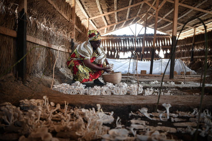 2024年2月6日,在中非共和國達馬拉,法蒂瑪在菇棚內(nèi)收獲菌草菇。2022年,法蒂瑪在聽說中國菌草專家在班吉傳授技術(shù)后主動前往學(xué)習(xí),從一間小菌棚起步,逐漸擴大為如今小有名氣的合作社?!⌒氯A社記者 韓旭 攝