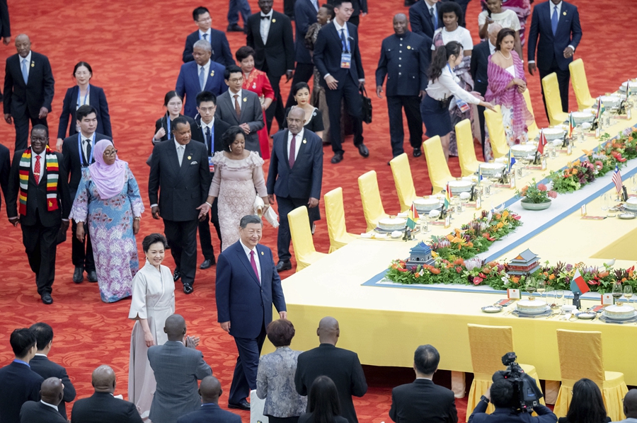 9月4日晚,國家主席習(xí)近平和夫人彭麗媛在北京人民大會(huì)堂舉行宴會(huì),歡迎來華出席中非合作論壇北京峰會(huì)的非方及國際貴賓。這是習(xí)近平和彭麗媛同貴賓們共同步入宴會(huì)廳。新華社記者 劉彬 攝