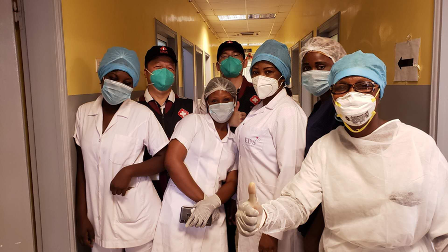 2020年5月26日,中國(guó)抗疫醫(yī)療專(zhuān)家組在剛果(布)首都布拉柴維爾指導(dǎo)新冠肺炎病房建設(shè)時(shí),與當(dāng)?shù)匾痪€(xiàn)醫(yī)務(wù)人員合影。新華社發(fā)