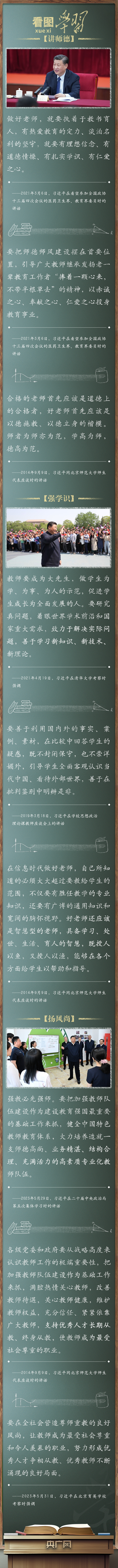 教育大計(jì),教師為本。黨的十八大以來(lái),以習(xí)近平同志為核心的黨中央堅(jiān)持把教育擺在優(yōu)先發(fā)展的戰(zhàn)略位置,推動(dòng)新時(shí)代教育事業(yè)取得歷史性成就、發(fā)生格局性變化。習(xí)近平總書(shū)記緊扣“培養(yǎng)什么人、怎樣培養(yǎng)人、為誰(shuí)培養(yǎng)人”這一教育的根本問(wèn)題,對(duì)建設(shè)新時(shí)代高素質(zhì)專業(yè)化教師隊(duì)伍作出一系列重要指示,激勵(lì)廣大教師立德修身、敬業(yè)立學(xué),強(qiáng)調(diào)要在全黨全社會(huì)弘揚(yáng)尊師重教的社會(huì)風(fēng)尚。在第四十個(gè)教師節(jié)到來(lái)之際,讓我們一起牢記并踐行總書(shū)記的殷殷囑托!