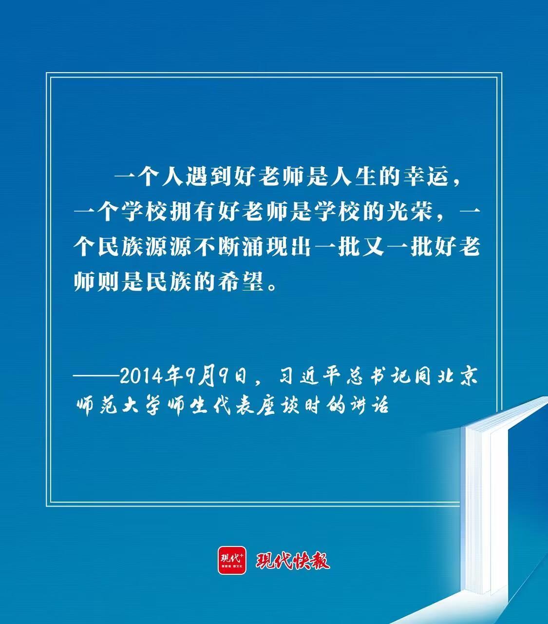 “一個(gè)人遇到好老師是人生的幸運(yùn),一個(gè)學(xué)校擁有好老師是學(xué)校的光榮,一個(gè)民族源源不斷涌現(xiàn)出一批又一批好老師則是民族的希望。”2014年教師節(jié)前夕,同北京師范大學(xué)師生代表座談時(shí),習(xí)近平總書記的殷殷期盼,激勵(lì)廣大教師為民族復(fù)興拼搏奮斗。