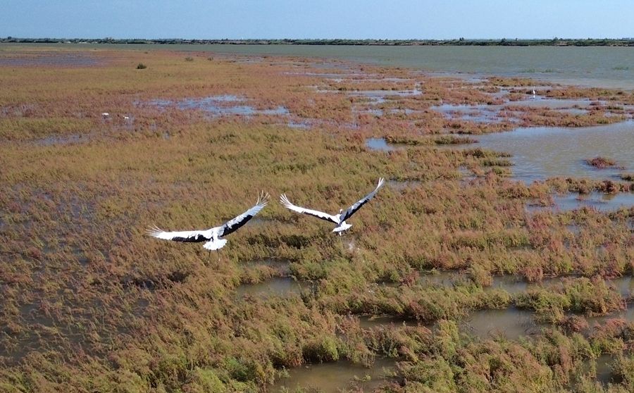 “我們這里是中國東方白鸛之鄉(xiāng)、黑嘴鷗繁殖地,去年以來還新發(fā)現了火烈鳥、白鵜鶘、勺嘴鷸?!碑數刎撠熗窘榻B,這些年通過退耕還濕、退養(yǎng)還灘,推進濕地修復,生態(tài)環(huán)境越來越好。