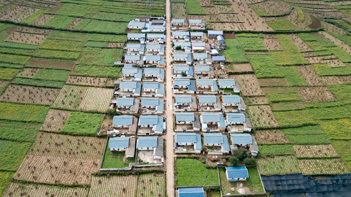 俯瞰四川省昭覺縣地莫鄉(xiāng)地莫村田園中的新居(2020年10月10日攝,無人機(jī)照片)。新華社記者 張笑宇 攝