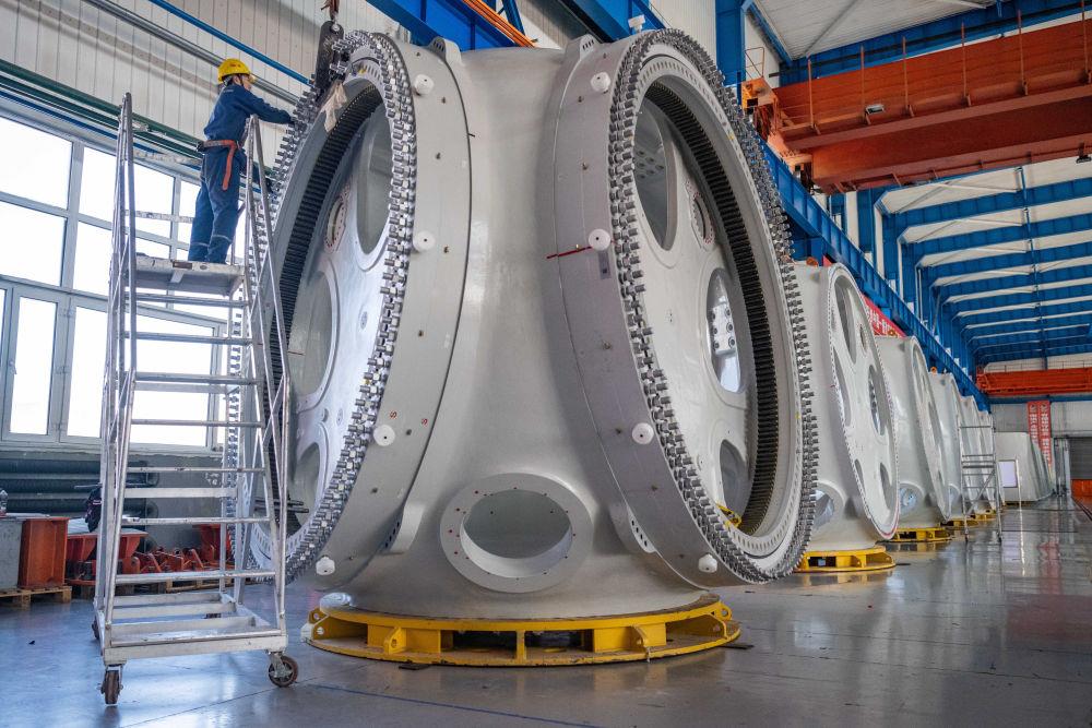 2024年4月28日,工作人員在中國一重集團有限公司的風(fēng)電設(shè)備裝配車間內(nèi)加工風(fēng)電輪轂。