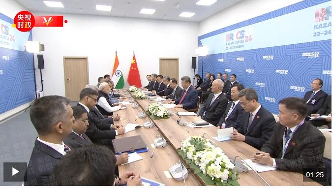 當(dāng)?shù)貢r(shí)間10月23日,國家主席習(xí)近平在喀山出席金磚國家領(lǐng)導(dǎo)人會晤期間會見印度總理莫迪。