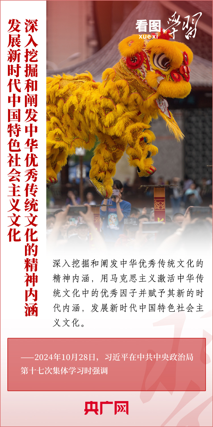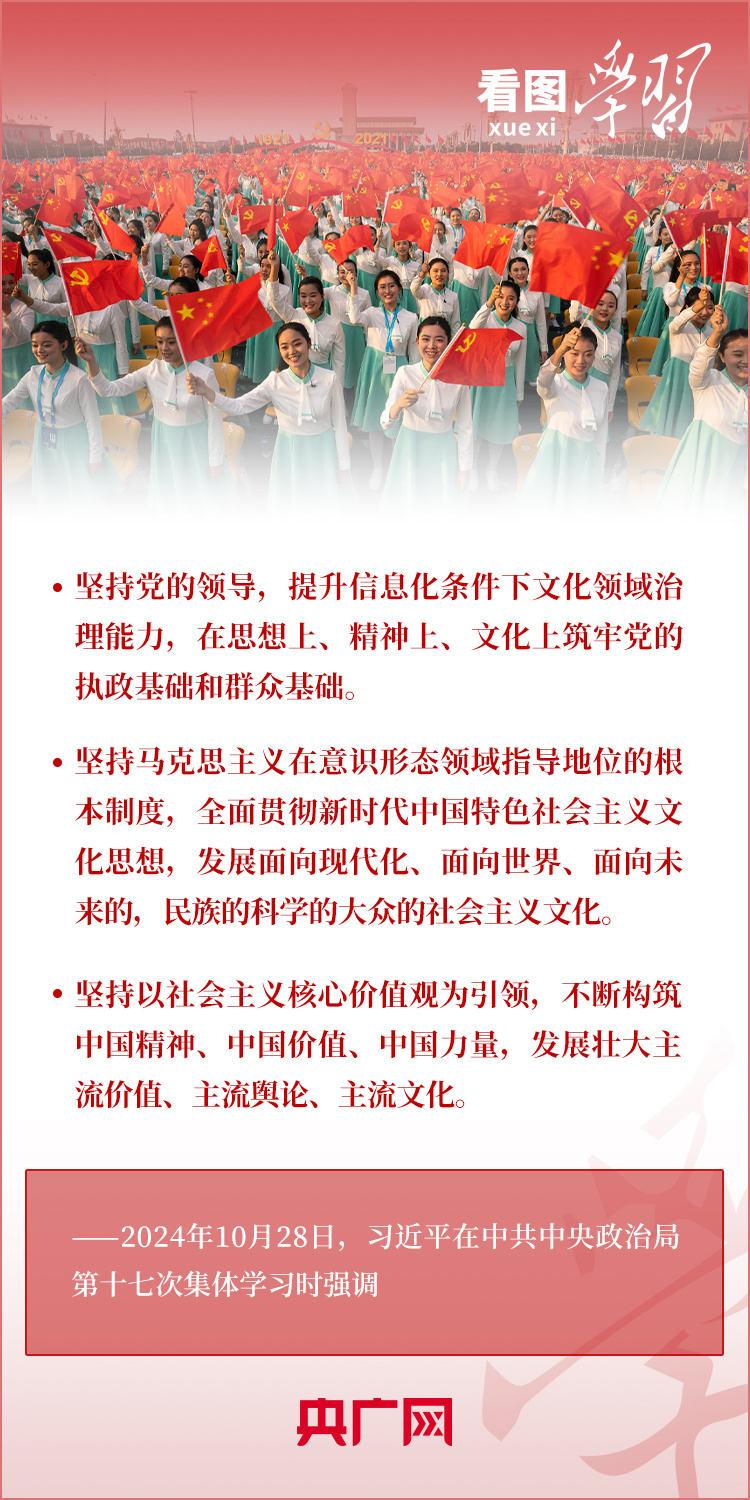 建設(shè)文化強(qiáng)國是全黨全社會的共同任務(wù)。10月28日,中共中央政治局就建設(shè)文化強(qiáng)國進(jìn)行第十七次集體學(xué)習(xí)。習(xí)近平總書記在聽取講解和討論后發(fā)表重要講話,就錨定2035年建成文化強(qiáng)國戰(zhàn)略目標(biāo)作出最新部署,強(qiáng)調(diào)要“不斷發(fā)展具有強(qiáng)大思想引領(lǐng)力、精神凝聚力、價值感召力、國際影響力的新時代中國特色社會主義文化,不斷增強(qiáng)人民精神力量,筑牢強(qiáng)國建設(shè)、民族復(fù)興的文化根基?!币黄饋韺W(xué)習(xí)!
