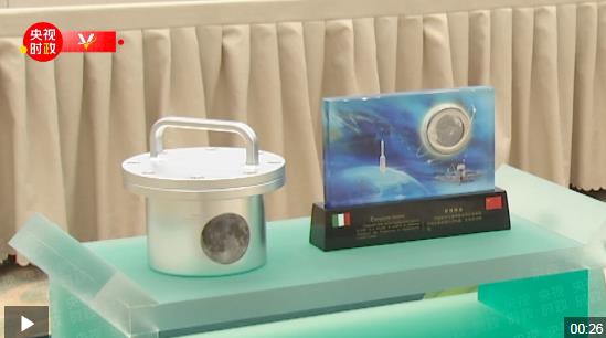 工藝擺件以嫦娥五號探月為設計元素,月球部分裝有月壤??蒲袠悠窞樵氯犁P取樣和鉆取樣,展現(xiàn)了中意航天領域合作高水平。