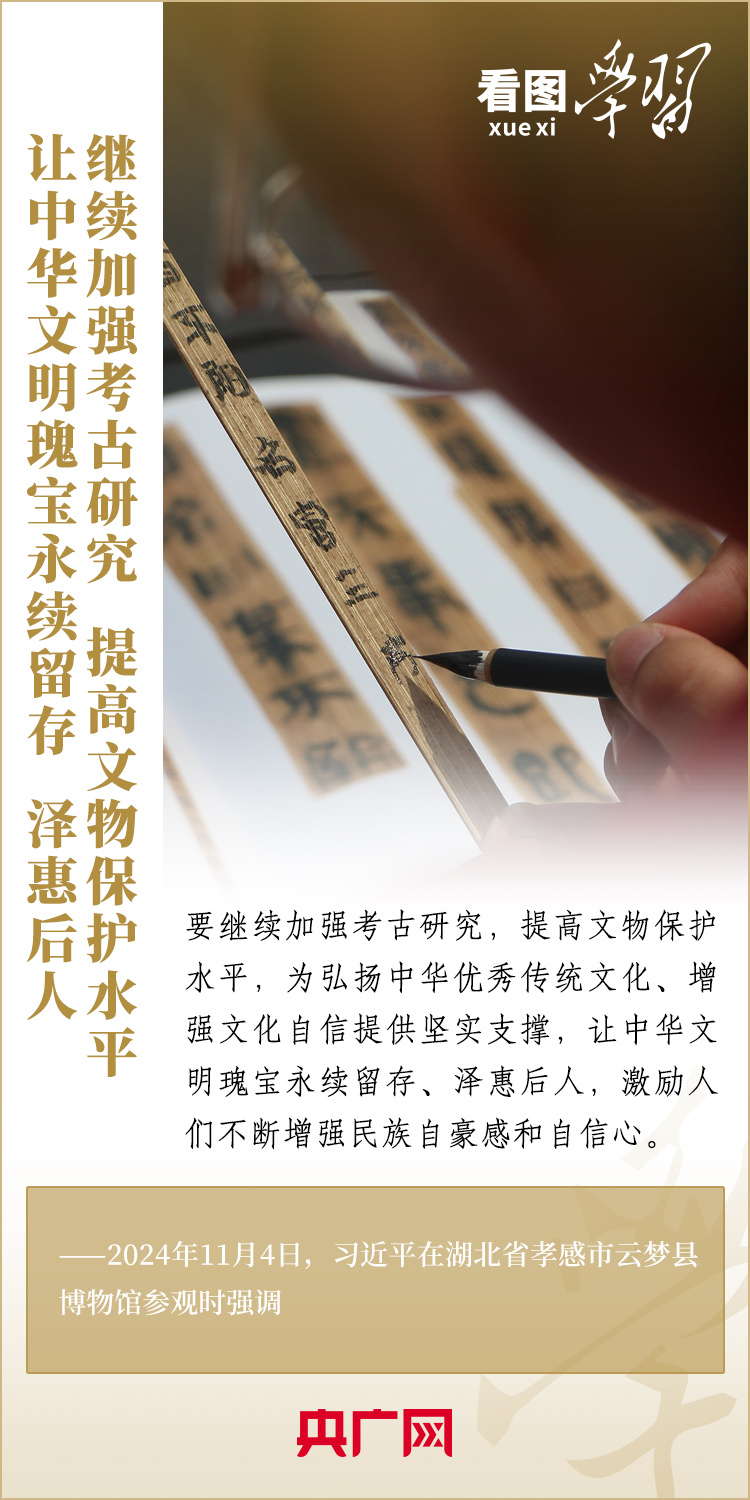 11月4日,習(xí)近平總書記在湖北省孝感市云夢縣博物館參觀出土秦漢簡牘展。這里收藏的我國考古史上首次發(fā)現(xiàn)的秦簡——云夢睡虎地秦簡,反映了戰(zhàn)國晚期到秦始皇時期的政治、經(jīng)濟、文化、法律、軍事等方面的情況。習(xí)總書記詳細(xì)聽取簡牘內(nèi)容、歷史文化價值和保護研究情況介紹,指出要繼續(xù)加強考古研究,提高文物保護水平,讓中華文明瑰寶永續(xù)留存、澤惠后人。