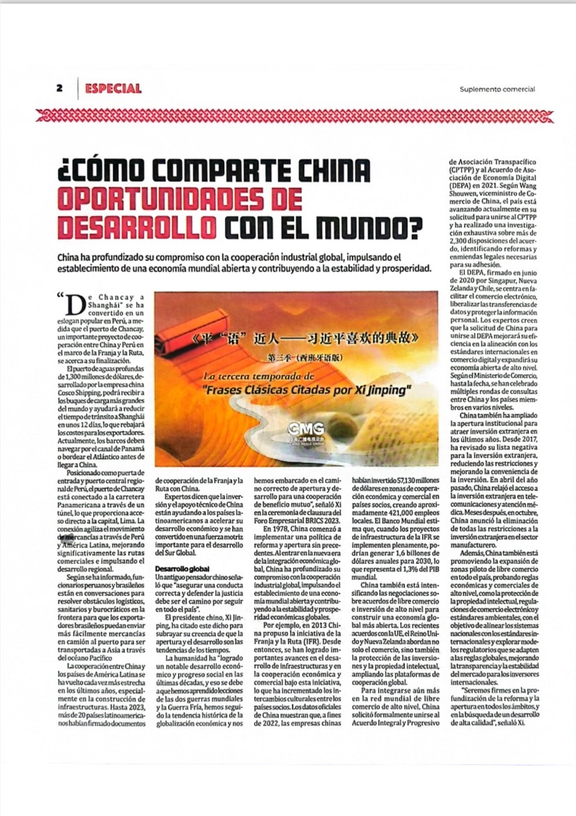 11月14日,秘魯最具影響力的官方報(bào)紙《秘魯人報(bào)》刊發(fā)節(jié)目在秘魯落播的消息。文章指出,《平“語(yǔ)”近人——習(xí)近平喜歡的典故》第三季展現(xiàn)了中華民族開放包容、兼收并蓄的文化胸懷,闡釋了習(xí)近平主席提出的推動(dòng)構(gòu)建人類命運(yùn)共同體的這一重大理念,是對(duì)“建設(shè)一個(gè)什么樣的世界、怎樣建設(shè)這個(gè)世界”給出的中國(guó)方案?!睹佤斎藞?bào)》特刊整版刊發(fā)《平“語(yǔ)”近人——習(xí)近平喜歡的典故》第三季(西班牙語(yǔ)版)將在秘魯主流媒體落播特稿?!睹佤斎藞?bào)》官網(wǎng)也同步刊發(fā)了節(jié)目預(yù)告消息和海報(bào)。