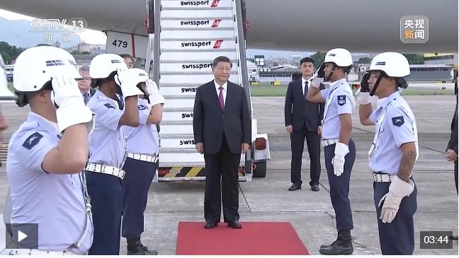 當(dāng)?shù)貢r(shí)間11月17日下午,習(xí)主席乘專機(jī)抵達(dá)里約熱內(nèi)盧加里昂空軍基地。巴西政府高級(jí)官員熱情迎接。巴西空軍號(hào)手吹號(hào)致敬,禮兵分列紅毯兩側(cè)。