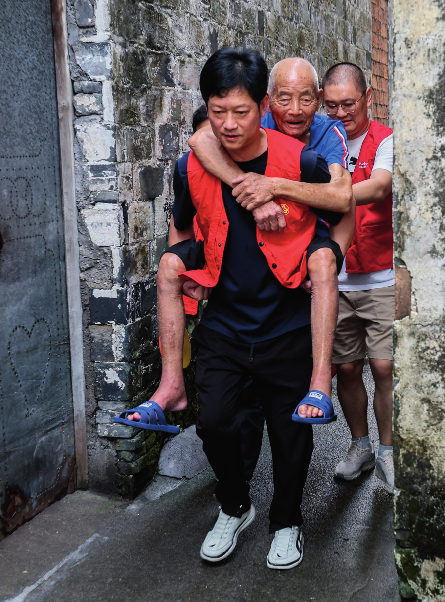 浙江省諸暨市趙家鎮(zhèn)泉畈村村干部和黨員志愿者在臺(tái)風(fēng)來(lái)臨前轉(zhuǎn)移危舊房里的老人(2024年9月19日攝)徐昱 攝
