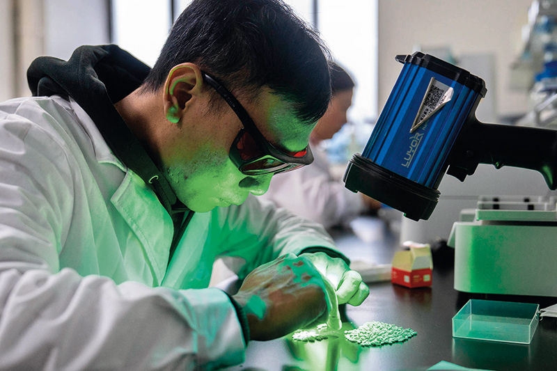 在湖南雜交水稻研究中心,工作人員通過(guò)熒光法進(jìn)行水稻樣本分析(2024年11月25日攝) 陳思汗攝 / 本刊