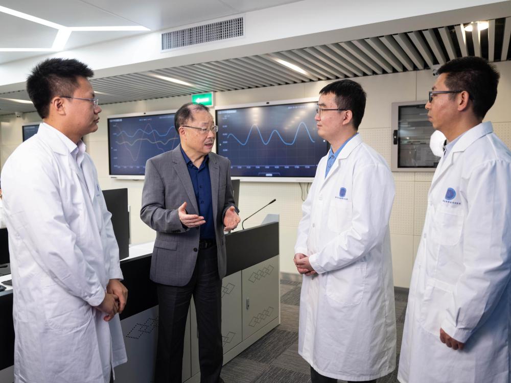 12月4日,澳門空間技術(shù)與應(yīng)用研究院院長張可可(左二)和“澳科一號(hào)”衛(wèi)星項(xiàng)目助理研究員尹亮(右二)交流。新華社發(fā)(張金加 攝)
