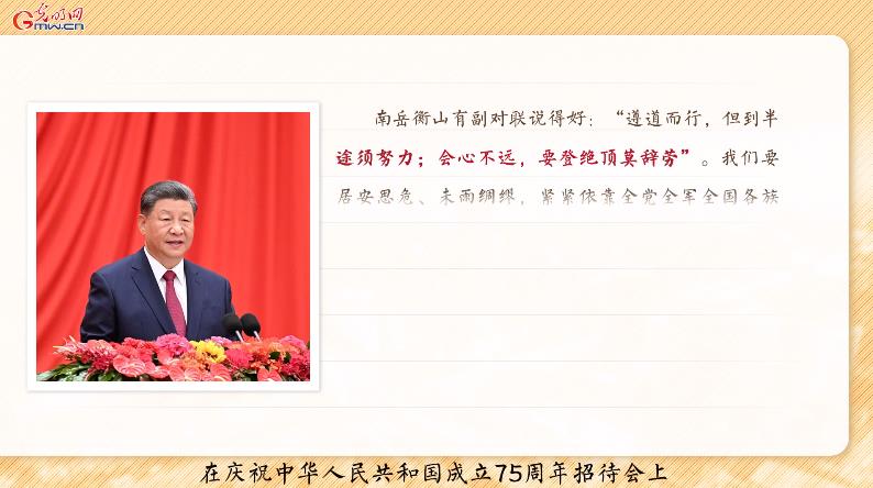 2024年是中華人民共和國成立75周年。9月30日,習(xí)近平總書記在慶祝中華人民共和國成立75周年招待會(huì)上的講話中引用南岳衡山的一副對(duì)聯(lián)“遵道而行,但到半途須努力;會(huì)心不遠(yuǎn),要登絕頂莫辭勞”,要求全黨同志居安思危、未雨綢繆,堅(jiān)決戰(zhàn)勝一切不確定難預(yù)料的風(fēng)險(xiǎn)挑戰(zhàn)。