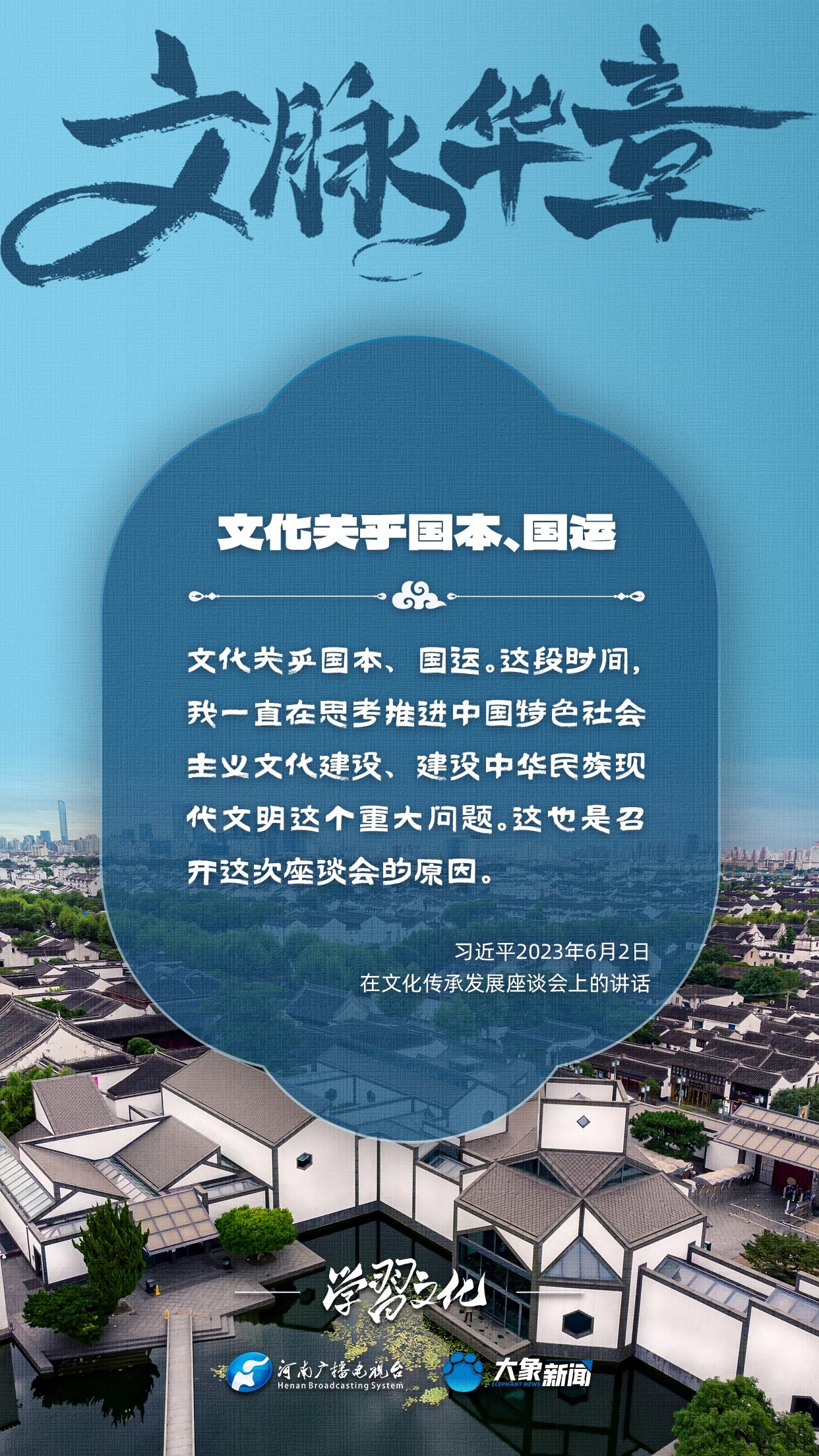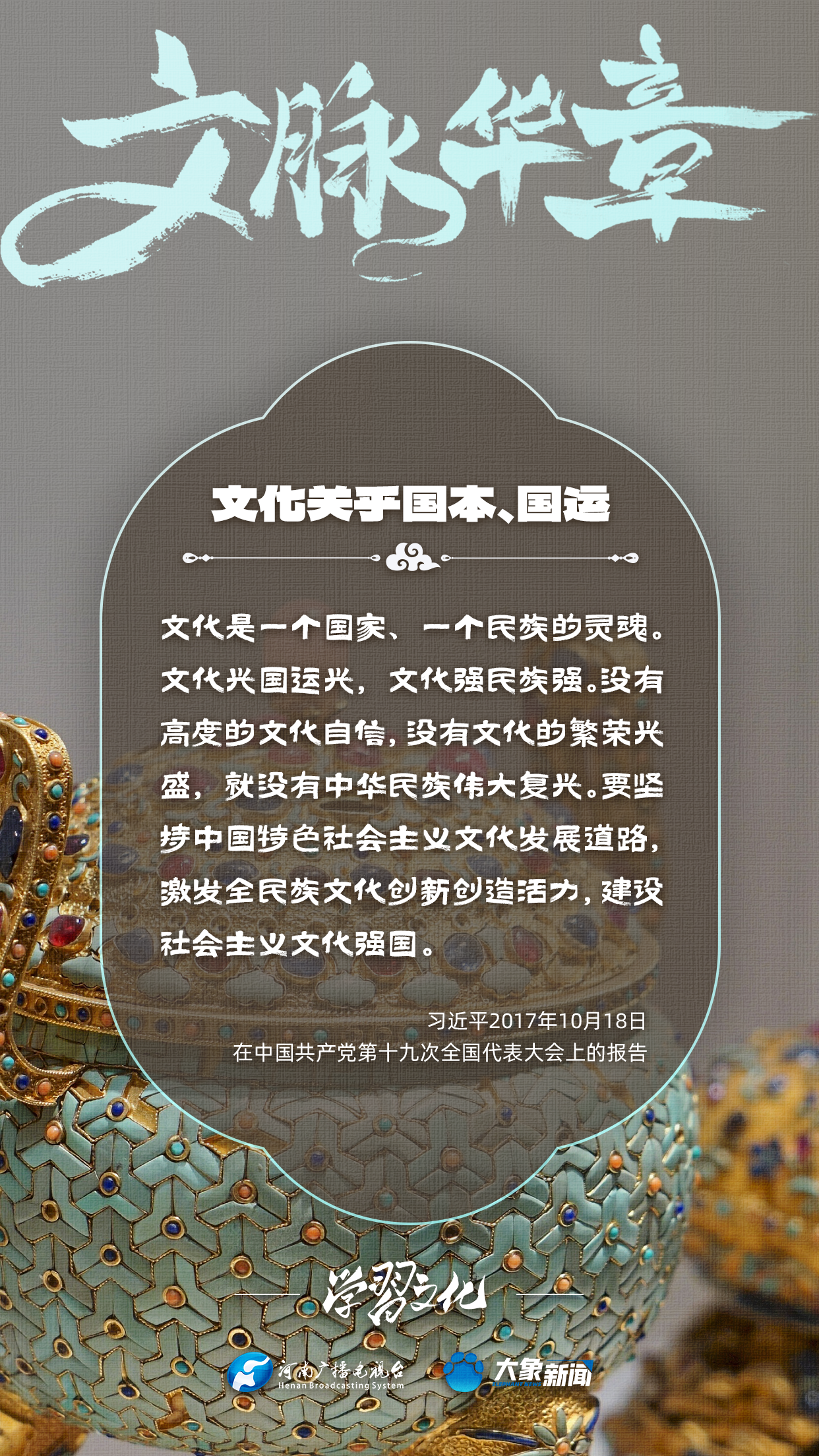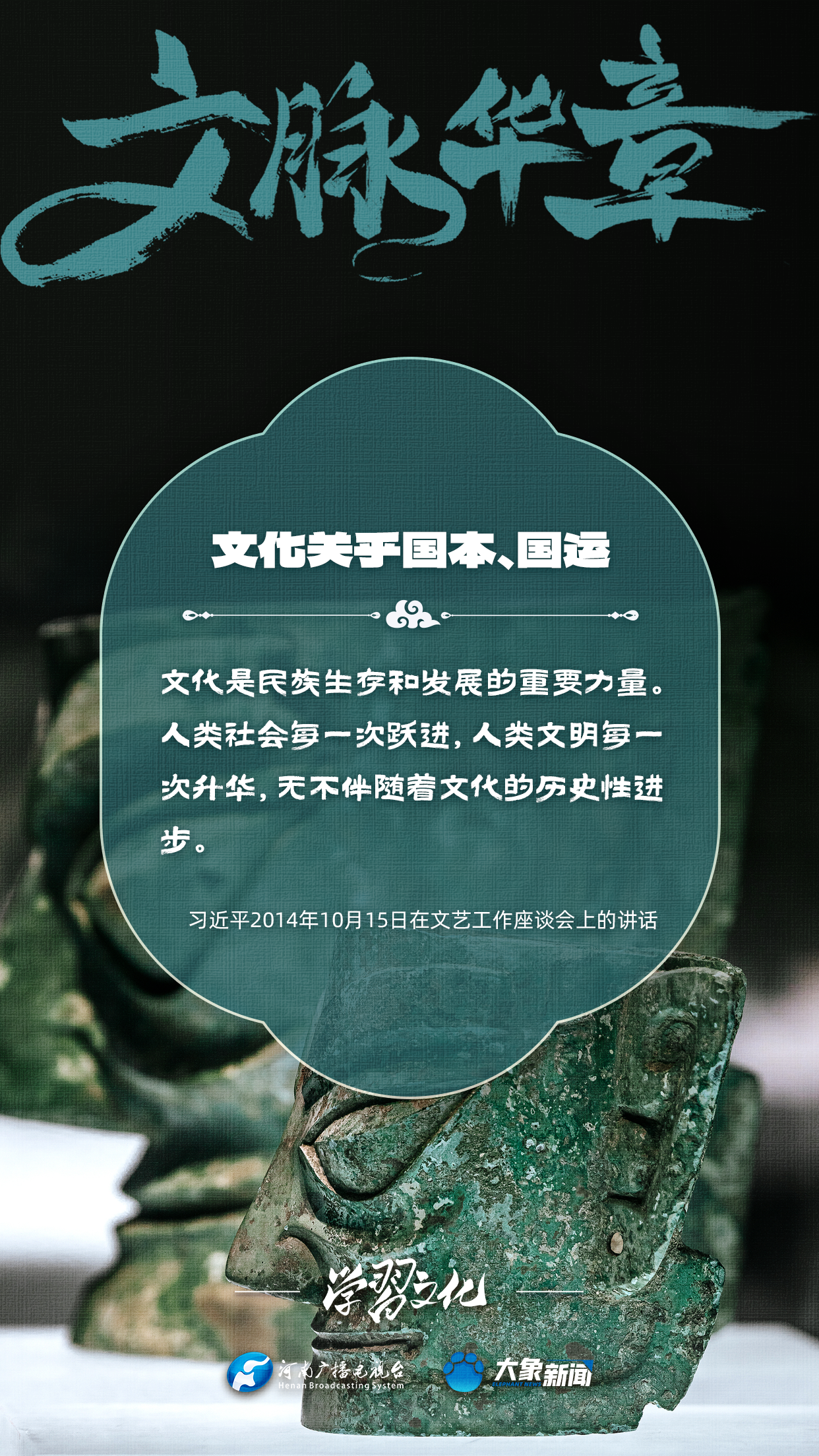 習(xí)近平總書記高度重視文化之于國(guó)家、之于民族的重大意義,強(qiáng)調(diào):文化是一個(gè)國(guó)家、一個(gè)民族的靈魂。文化興國(guó)運(yùn)興,文化強(qiáng)民族強(qiáng)。沒有高度的文化自信,沒有文化的繁榮興盛,就沒有中華民族偉大復(fù)興。大象新聞梳理了習(xí)近平總書記的系列重要論述,我們一起學(xué)習(xí)。