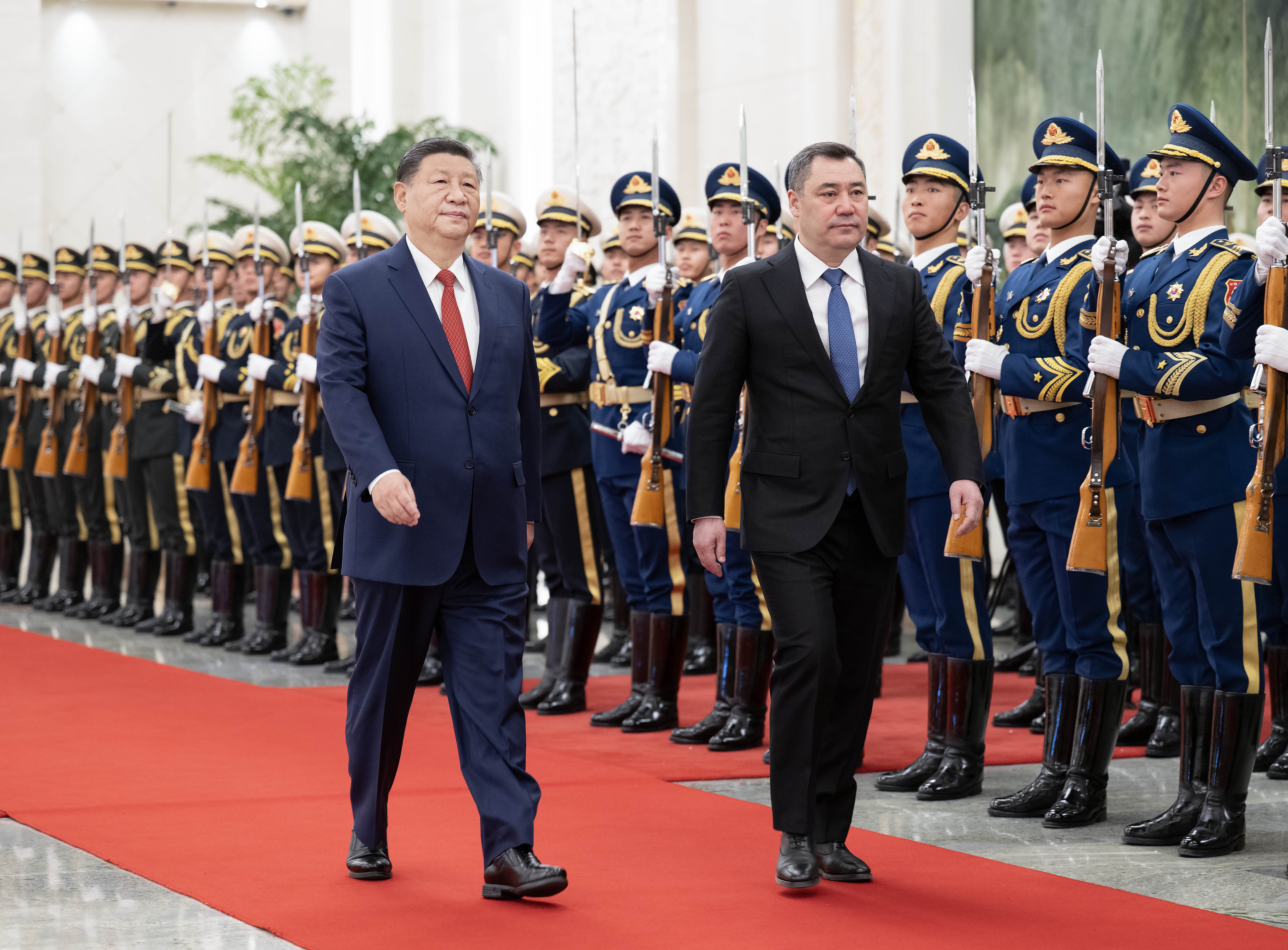 天安門廣場(chǎng)鳴放21響禮炮,禮兵列隊(duì)致敬。兩國(guó)元首登上檢閱臺(tái),軍樂(lè)團(tuán)奏中吉兩國(guó)國(guó)歌。扎帕羅夫在習(xí)近平陪同下檢閱中國(guó)人民解放軍儀仗隊(duì),并觀看分列式。