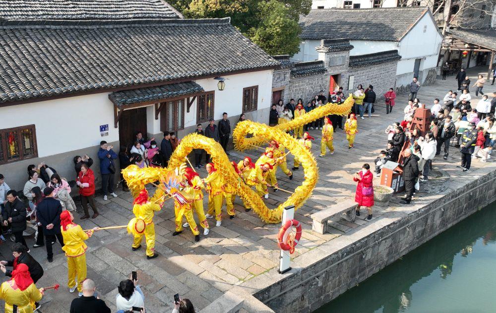 2月10日,浙江湖州市德清縣新市古鎮(zhèn)舞龍表演。