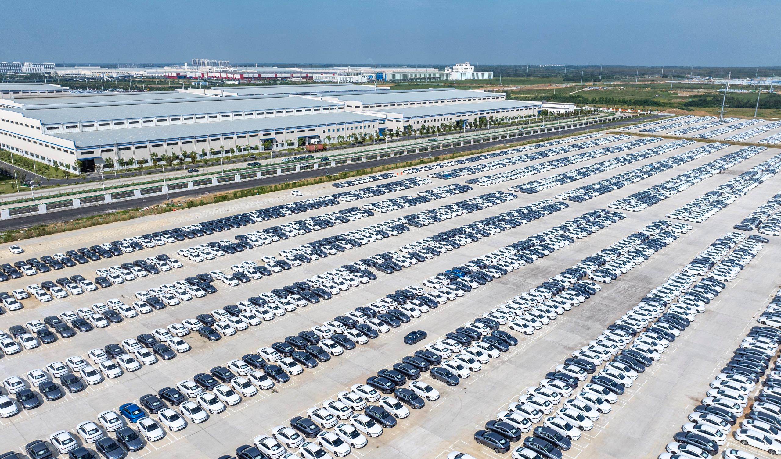 2024年9月,安徽合肥,整齊停放的新能源汽車正在等待裝車銷往國內(nèi)外市場(chǎng)。