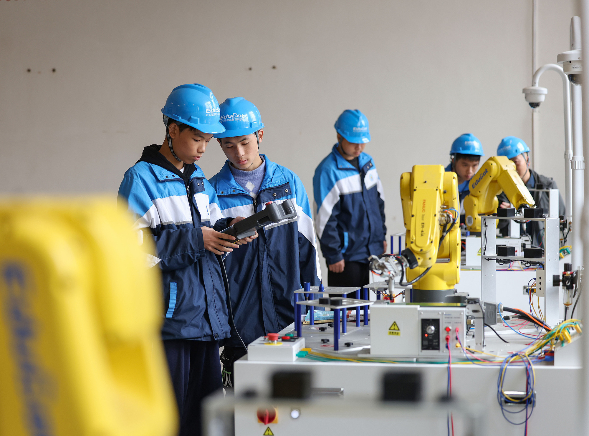 職業(yè)學(xué)校的學(xué)生在進行工業(yè)機器人實操