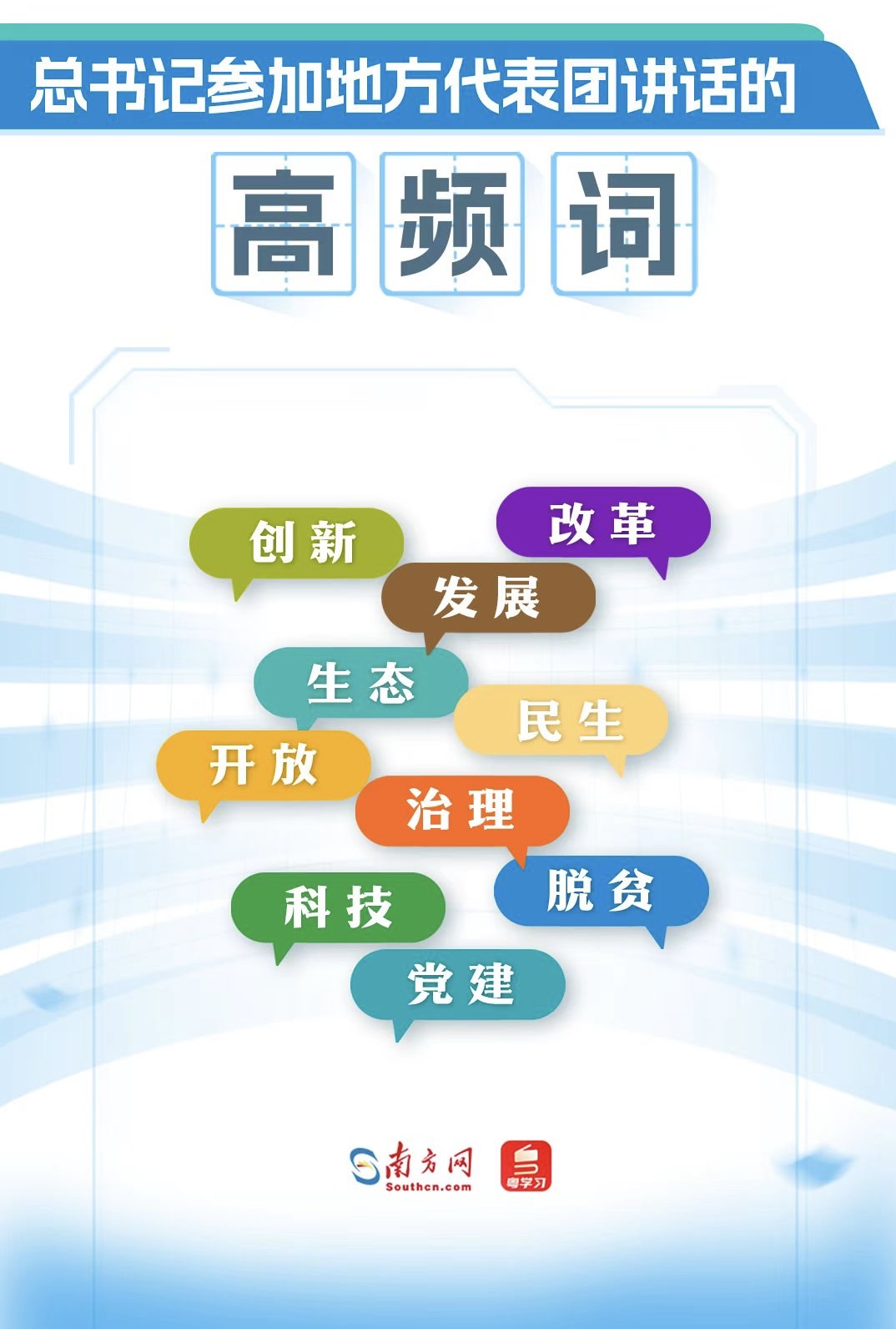 13年36次參加地方代表團(tuán)審議,習(xí)近平總書記的講話里,有哪些高頻詞?從詞云圖中,“創(chuàng)新”“改革”“發(fā)展”“生態(tài)”“民生”“開放”“治理”“脫貧”“科技”“黨建”等詞語引人注目,反映了總書記的關(guān)注點。