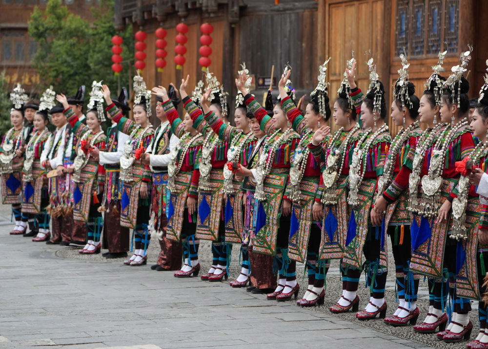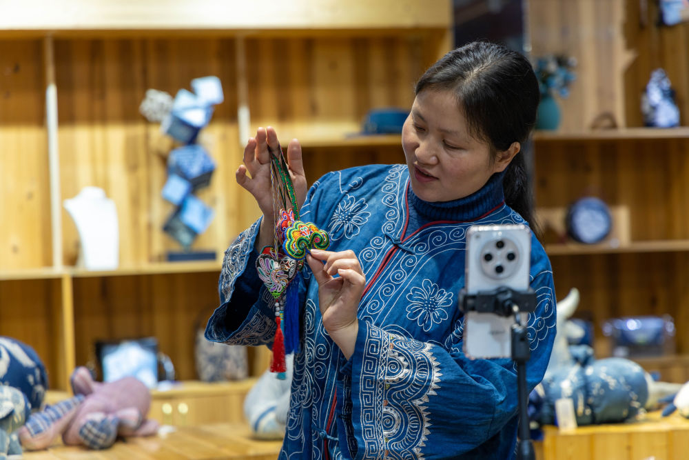 2025年3月14日,村民在肇興侗寨內(nèi)通過手機直播銷售刺繡作品。侗繡承載著侗族人的信仰與記憶,年輕繡娘的手藝多半來自母親傳承,侗族婦女用一針一線將民族古老的神話傳說、歷史風(fēng)俗記錄在服飾的紋樣里,讓這門手藝在侗鄉(xiāng)世代傳承。2011年,侗族刺繡被列入國家級非物質(zhì)文化遺產(chǎn)名錄。