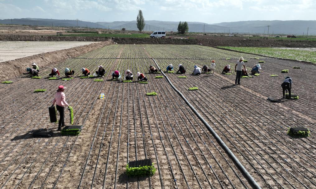 甘肅省定西市安定區(qū)內官營鎮(zhèn)菜農在鋪設了滴灌管道的地里移植西芹(資料圖片)。(楊曉軍 攝)