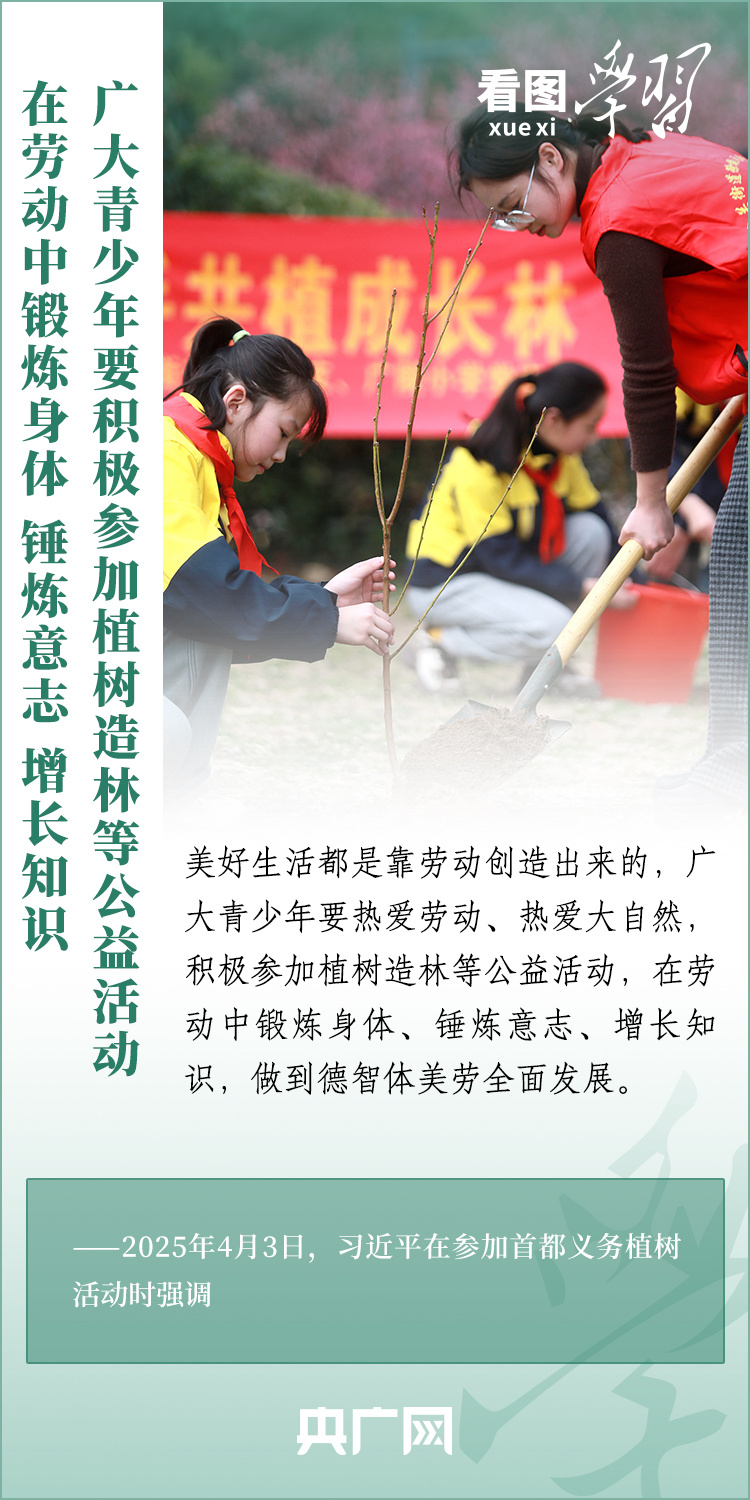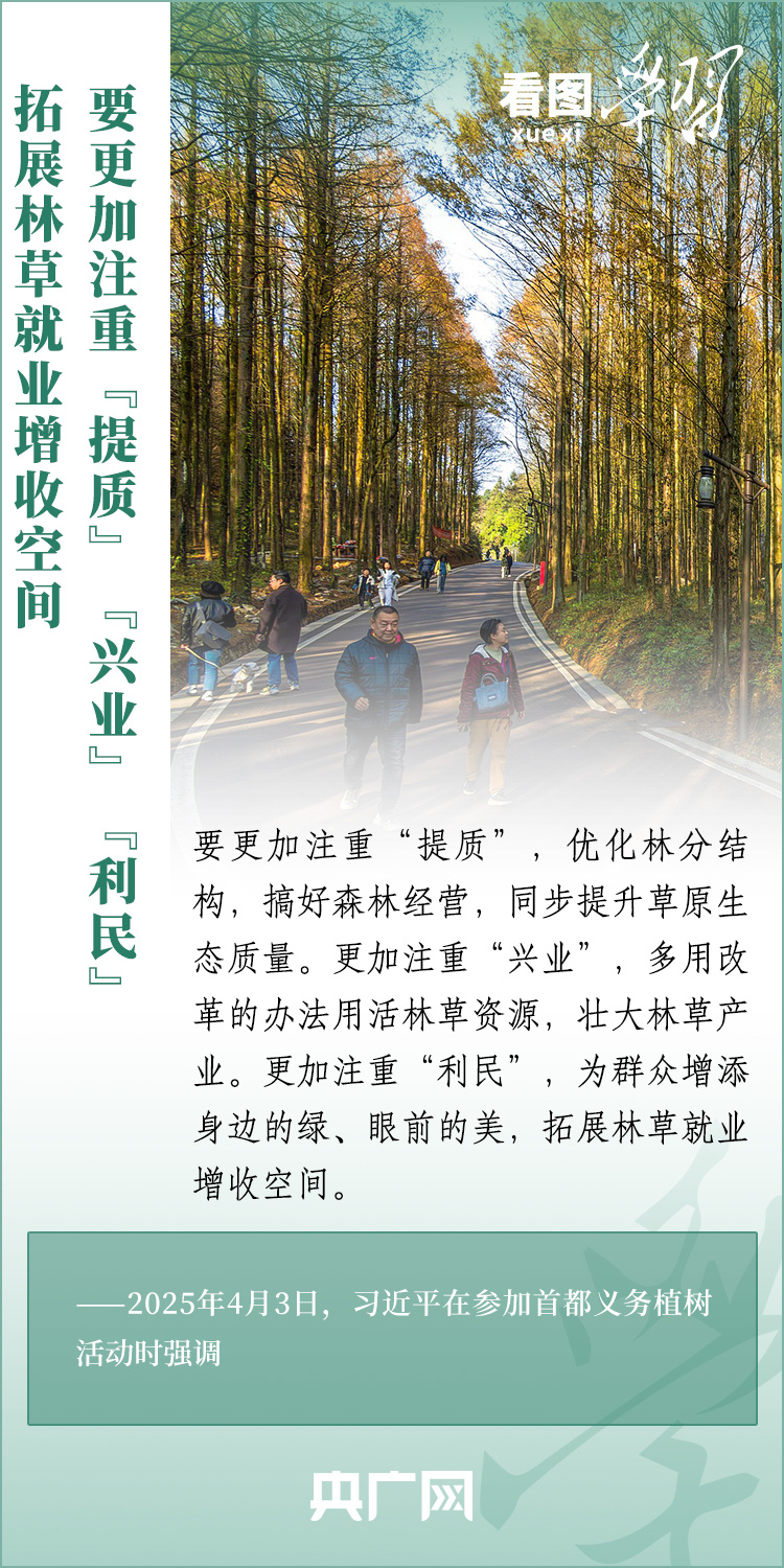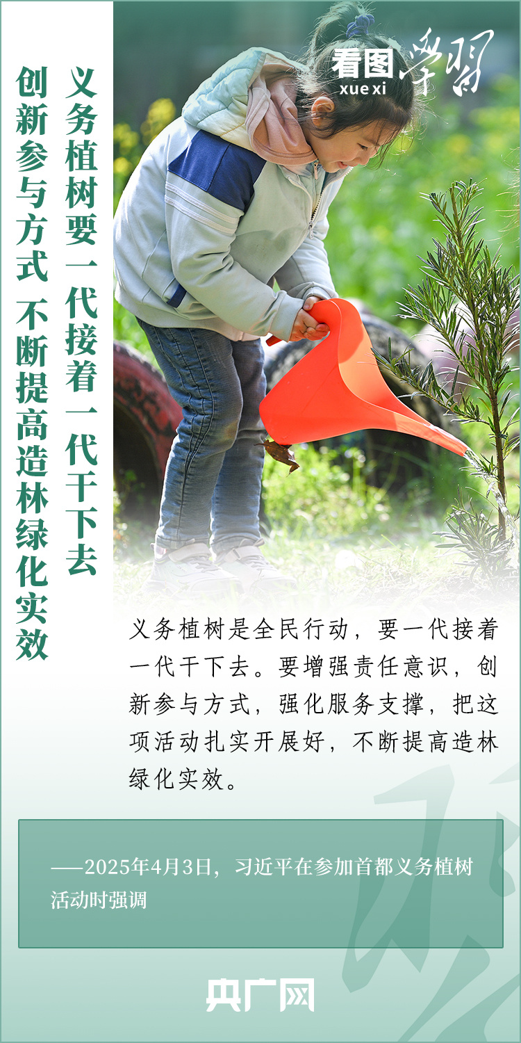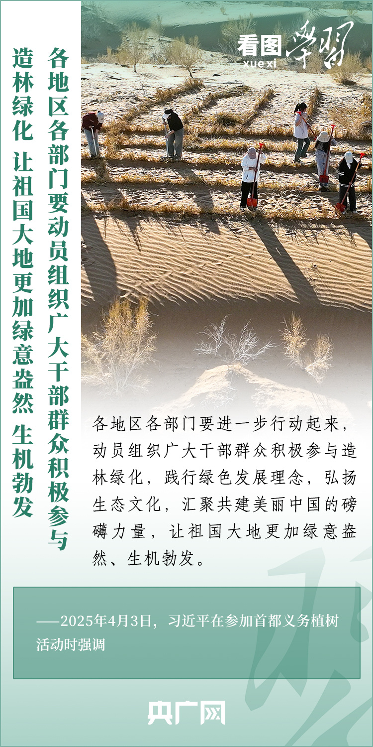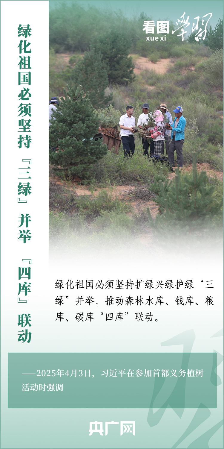植樹造林是生態(tài)文明建設(shè)重要一環(huán)。4月3日,習(xí)近平總書記參加首都義務(wù)植樹活動(dòng)。在植樹現(xiàn)場(chǎng),總書記高度肯定國土綠化工作取得來之不易的成績(jī),強(qiáng)調(diào)綠化祖國必須堅(jiān)持“三綠”并舉、“四庫”聯(lián)動(dòng),要更加注重“提質(zhì)”“興業(yè)”“利民”,“匯聚共建美麗中國的磅礴力量,讓祖國大地更加綠意盎然、生機(jī)勃發(fā)”。一起來學(xué)習(xí)!