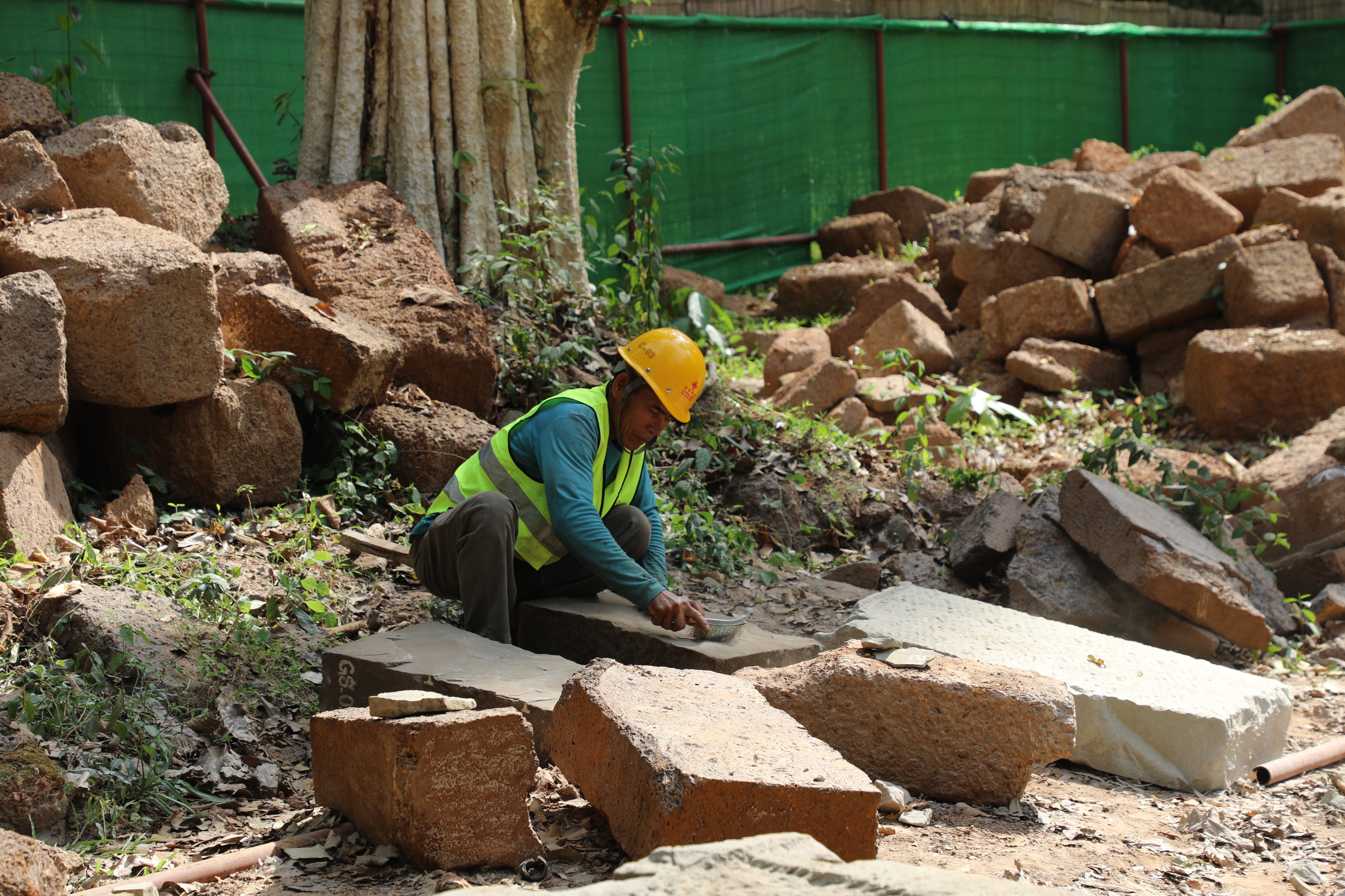 一名柬埔寨工人正在王宮遺址修復(fù)現(xiàn)場工作。(人民日報(bào)記者曹師韻 攝)