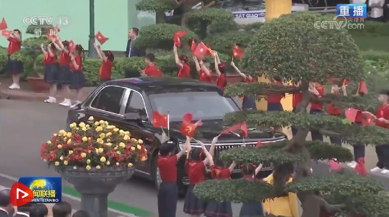 四月的河內,林木蔥郁,生機盎然。主席府廣場上,五星紅旗同金星紅旗迎風飄揚,200多名越南少年兒童揮舞旗幟,熱烈歡迎習近平到訪。