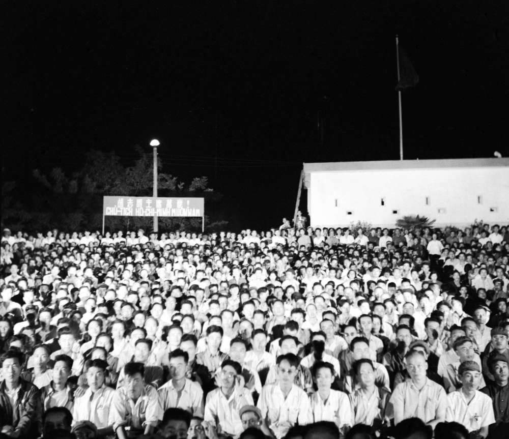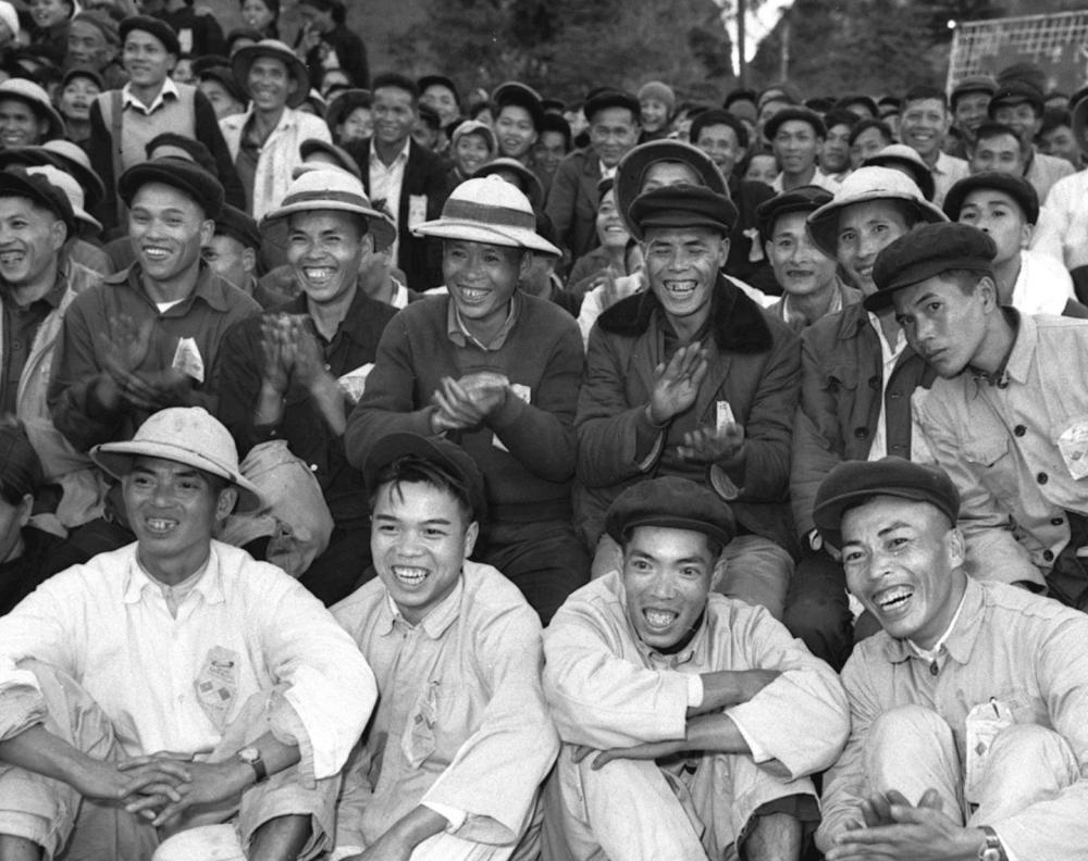 1959年12月,來(lái)自越南的客人在兩國(guó)邊境居民慶祝共建水利工程完工聯(lián)歡會(huì)上觀看演出。