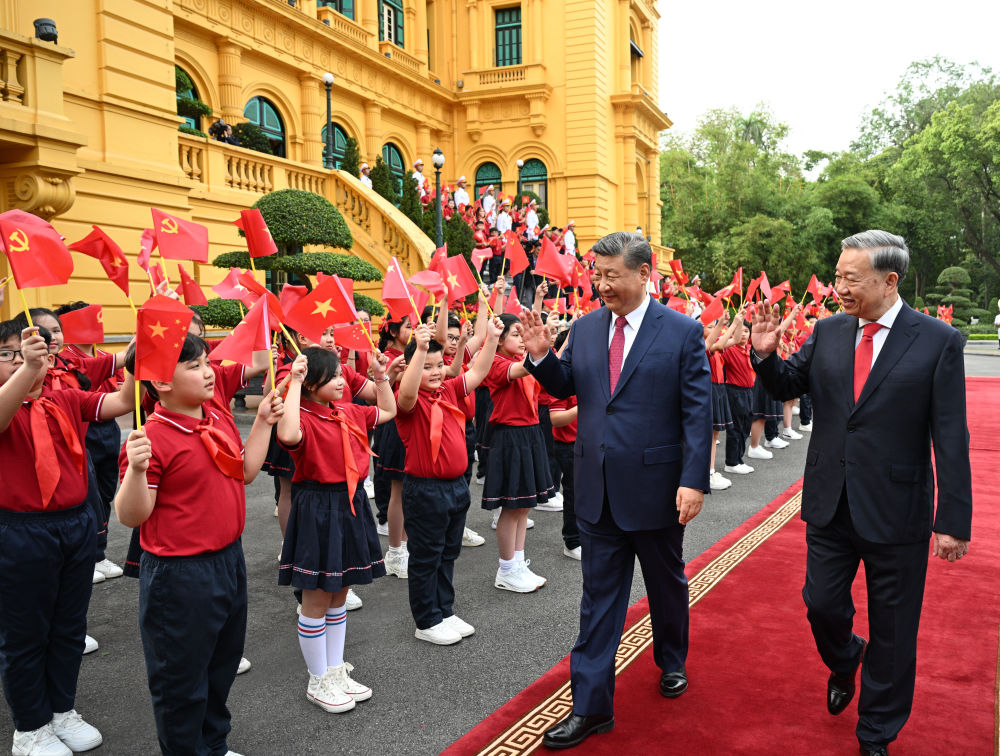 越共中央總書記蘇林為對越南進行國事訪問的中共中央總書記、國家主席習近平舉行隆重歡迎儀式,兩位領(lǐng)導人在紅毯上并肩前行。