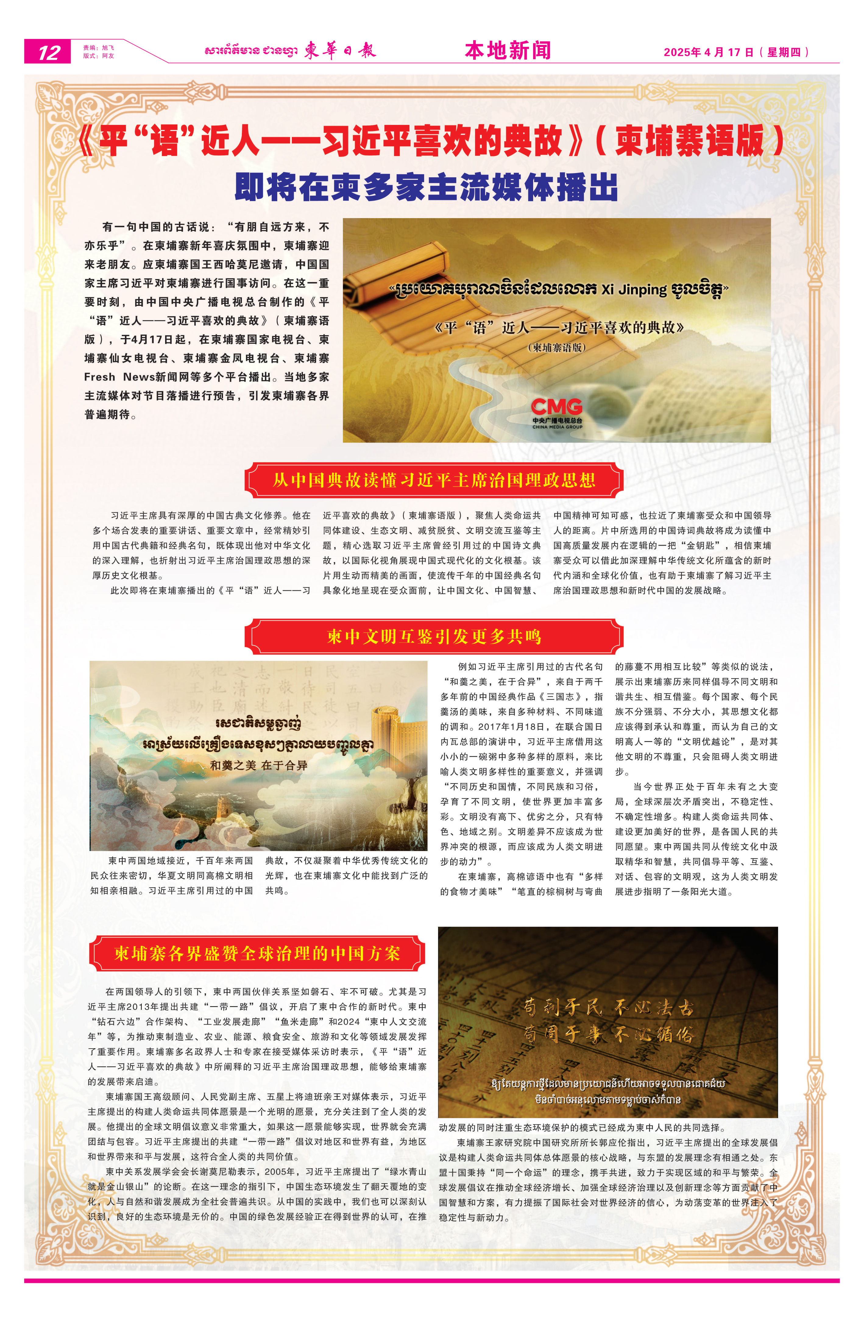 4月12日至17日,《柬華日?qǐng)?bào)》《大都市報(bào)》等當(dāng)?shù)貓?bào)紙刊發(fā)節(jié)目播出預(yù)告消息。文章指出,《平“語”近人——習(xí)近平喜歡的典故》(柬埔寨語版)是一把讀懂中國(guó)高質(zhì)量發(fā)展內(nèi)在邏輯的“金鑰匙”,相信柬埔寨受眾可以通過這些中國(guó)古籍和經(jīng)典名句加深理解中華優(yōu)秀傳統(tǒng)文化所蘊(yùn)含的新時(shí)代內(nèi)涵和全球化價(jià)值,了解習(xí)近平主席治國(guó)理政思想和新時(shí)代中國(guó)的發(fā)展戰(zhàn)略。