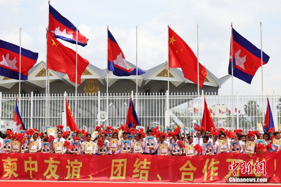 當?shù)貢r間4月17日上午,中國國家主席習(xí)近平乘專機抵達金邊,應(yīng)柬埔寨國王西哈莫尼邀請,對柬埔寨進行國事訪問。數(shù)百名當?shù)孛癖姄]舞兩國國旗,手持“柬中友誼、團結(jié)、合作萬歲!”等紅色橫幅,熱烈歡迎習(xí)近平到訪。中新社記者 盛佳鵬 攝