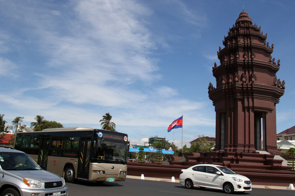 2018年1月5日,在柬埔寨金邊,一輛中國援助的“宇通”公交車經(jīng)過獨(dú)立紀(jì)念碑。