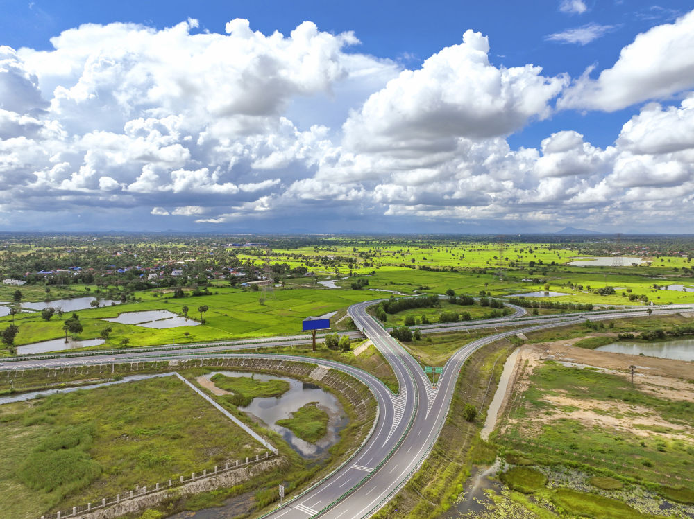 2024年9月25日在柬埔寨磅士卑省拍攝的金港高速公路(無人機(jī)照片)。連接柬埔寨首都金邊和最大深水海港西哈努克港的金港高速公路,是中柬共建“一帶一路”標(biāo)志性項目。