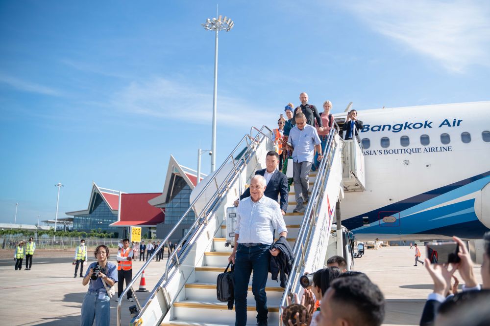 2023年10月16日,由中國企業(yè)在海外以“BOT模式(建設(shè)-運(yùn)營-移交)”建設(shè)的柬埔寨暹粒吳哥國際機(jī)場通航運(yùn)營。這是該機(jī)場首架進(jìn)港客機(jī)乘客走下飛機(jī)。