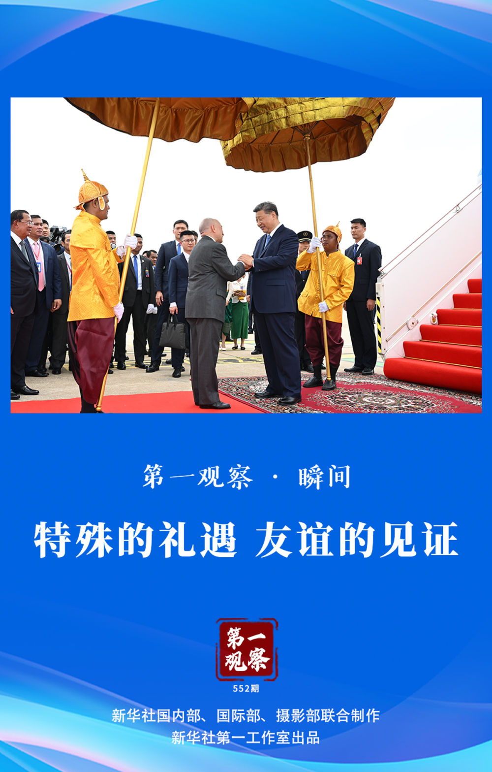 這是西哈莫尼國(guó)王首次在機(jī)場(chǎng)舉行盛大儀式歡迎外國(guó)貴賓。柬埔寨王室珍娜公主向習(xí)近平主席獻(xiàn)上茉莉花手環(huán),數(shù)百名當(dāng)?shù)孛癖姄]舞兩國(guó)國(guó)旗,手持“柬中友誼、團(tuán)結(jié)、合作萬(wàn)歲!”等紅色橫幅熱情歡迎中國(guó)朋友……