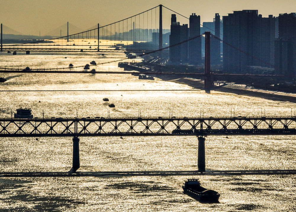 2024年1月23日,一列火車從武漢長江大橋上駛過(無人機照片)。
