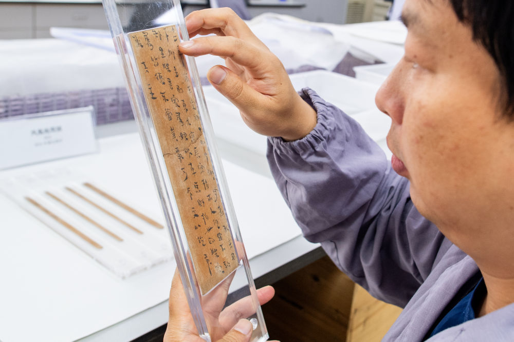 2023年5月20日,湖北荊州文物保護中心的修復人員史少華在查看修復完成的簡牘。荊州文物保護中心是我國簡牘修復領域?qū)嵙ψ顝姷臋C構(gòu)之一,近年來累計完成13萬多枚竹木簡牘的脫水工作,飽水簡牘修復量占全國90%以上。