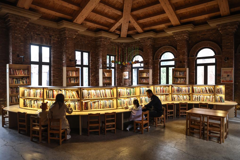 4月17日,小朋友在家長的陪同下在沈陽市鐵西區(qū)奉天工場文創(chuàng)園內(nèi)的城市書房內(nèi)讀書。新華社記者 潘昱龍 攝