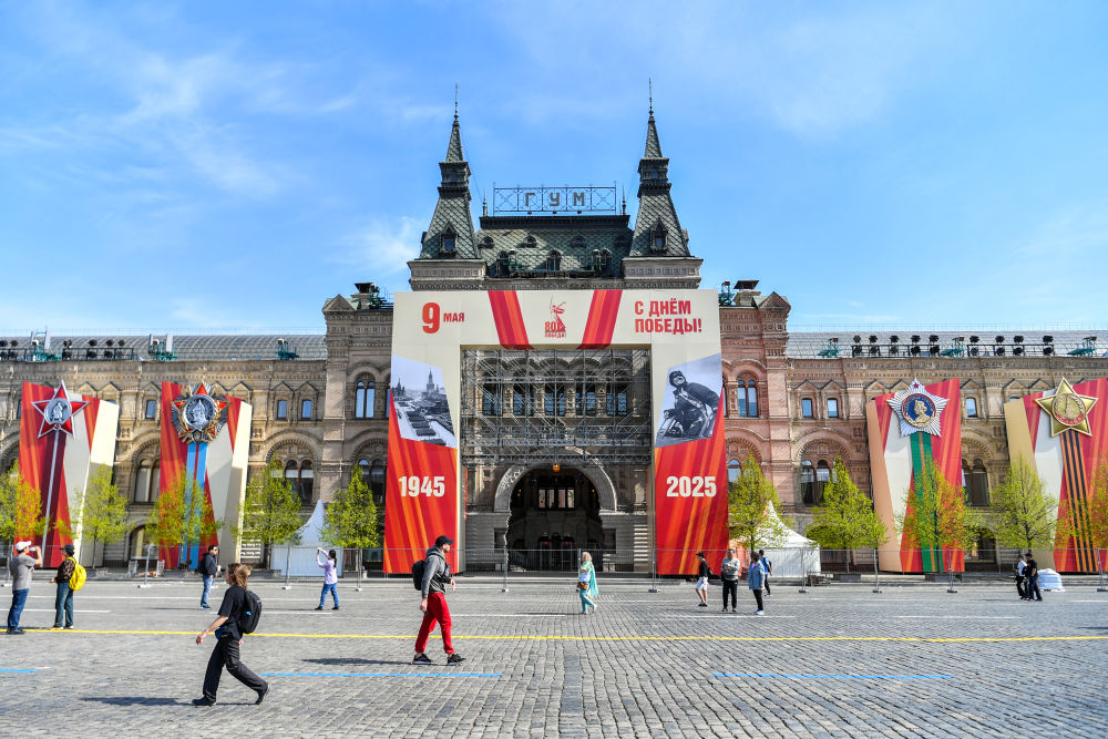 紀念蘇聯(lián)偉大衛(wèi)國戰(zhàn)爭勝利80周年慶典前夕,莫斯科街頭,寫有“勝利”字樣的旗幟隨風飄揚。在路邊,以蘇聯(lián)衛(wèi)國戰(zhàn)爭歷史為主題的圖片展板和裝飾櫥窗吸引行人停下腳步,或合影留念,或瀏覽沉思。