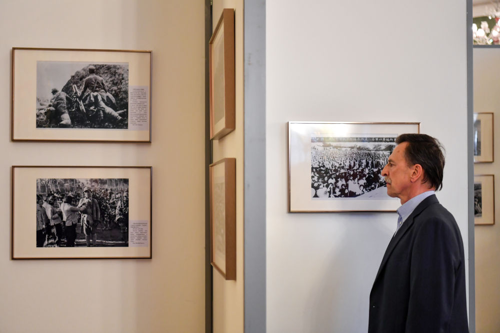 4月18日,在俄羅斯首都莫斯科,嘉賓參觀紀念中國人民抗日戰(zhàn)爭暨世界反法西斯戰(zhàn)爭勝利80周年圖片展。新華社記者 曹陽 攝