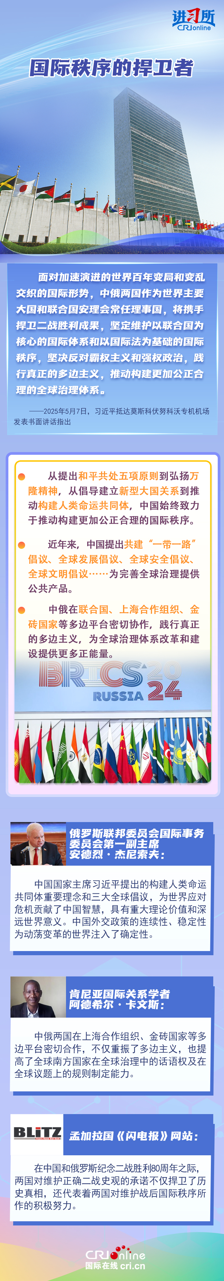 “兩國(guó)人民用鮮血和生命凝結(jié)的深厚情誼,如黃河之水奔騰不息,似伏爾加河寬廣深沉,成為中俄世代友好的不竭源泉?!苯衲晔侵袊?guó)人民抗日戰(zhàn)爭(zhēng)、蘇聯(lián)偉大衛(wèi)國(guó)戰(zhàn)爭(zhēng)暨世界反法西斯戰(zhàn)爭(zhēng)勝利80周年,也是聯(lián)合國(guó)成立80周年。在這一重要?dú)v史時(shí)間節(jié)點(diǎn),習(xí)近平主席此訪(fǎng)不僅為中俄關(guān)系發(fā)展注入強(qiáng)勁動(dòng)力,也向世界宣示中俄兩國(guó)攜手捍衛(wèi)二戰(zhàn)勝利成果的堅(jiān)定意志。