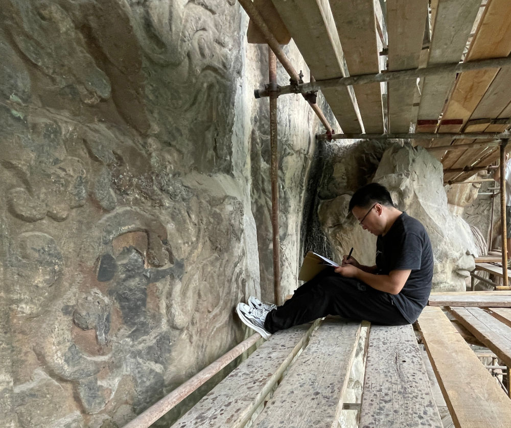 習(xí)近平總書記來到龍門石窟時,龍門石窟研究院考古研究中心工作人員谷宏耀正和其他部門同事共同對石窟進行調(diào)查記錄。