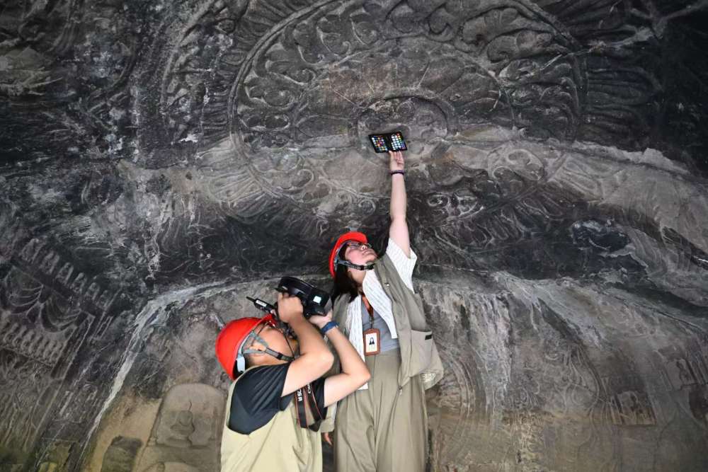 4月10日,龍門石窟研究院工作人員(右)與武漢大學(xué)文化遺產(chǎn)智能計算實驗室團隊成員一同對龍門石窟魏字洞進行高清攝影掃描。新華社記者 李嘉南 攝