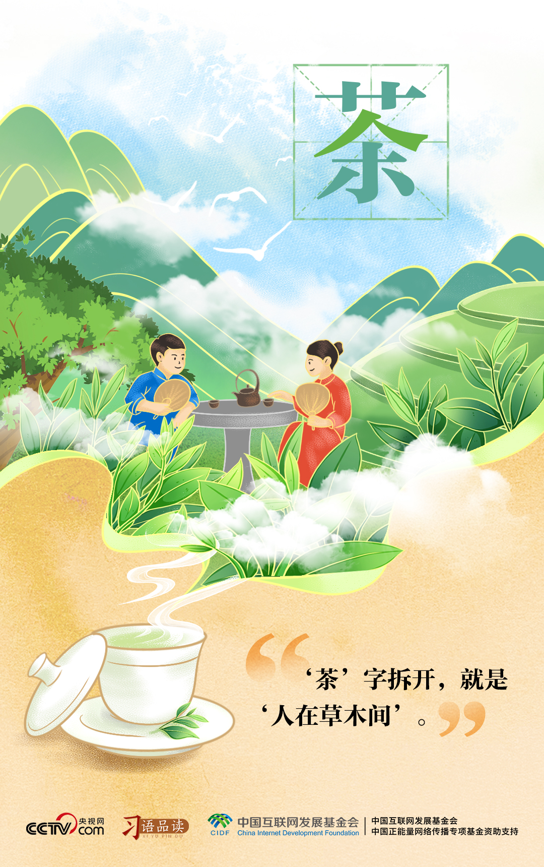 不同的交流場景,蘊(yùn)藏著相通的茶文化。總書記先將“茶”字拆解為“人在草木間”,形象描繪種茶、采茶、制茶和飲茶過程中人與自然和諧共生的畫面。之后,總書記又以“因茶致富”“因茶興業(yè)”闡釋茶的經(jīng)濟(jì)價值和賦能千行百業(yè)發(fā)展的多元價值。