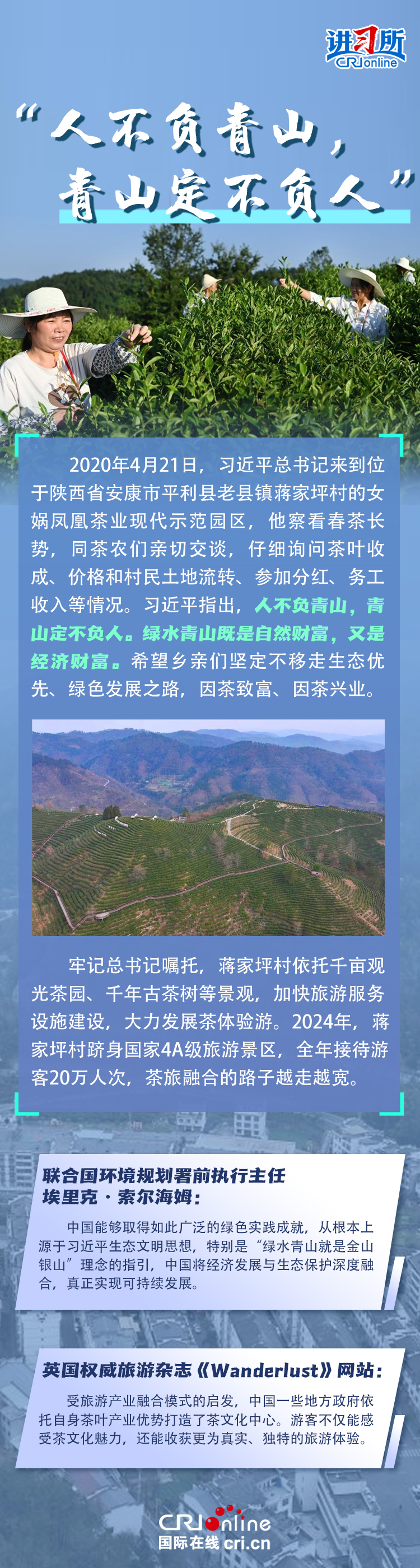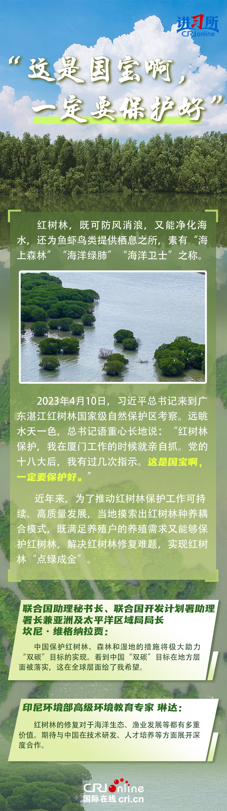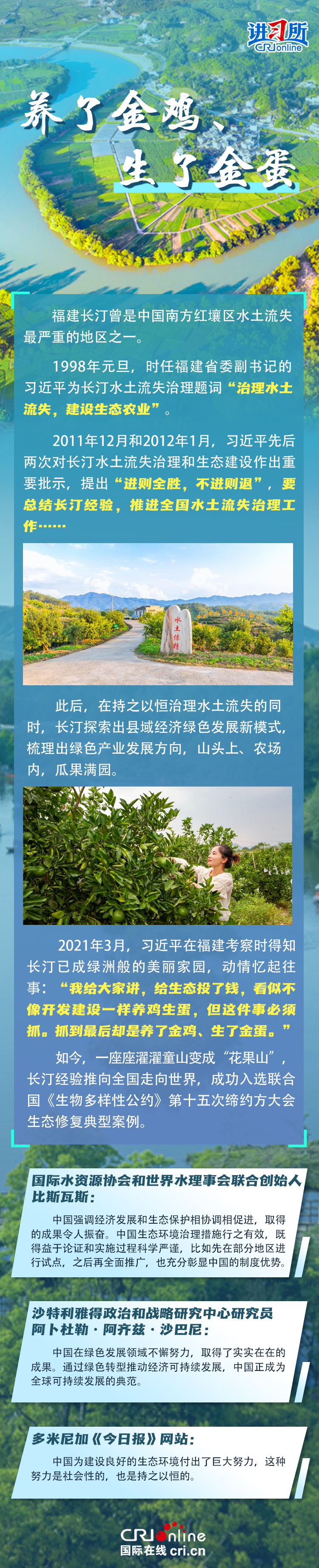 新時代以來,在習近平生態(tài)文明思想的科學指引下,“兩山”理念已深入人心,從“點綠成金”的紅樹林到一座座“花果山”,再到走向世界的長汀經(jīng)驗……美麗中國建設邁出重大步伐,生態(tài)環(huán)境保護發(fā)生歷史性變化。國際社會認為,中國取得廣泛的綠色發(fā)展成就,從根本上源于習近平生態(tài)文明思想,特別是“兩山”理念的指引。在通過綠色轉(zhuǎn)型推動經(jīng)濟可持續(xù)發(fā)展方面,中國正成為全球可持續(xù)發(fā)展的典范。
