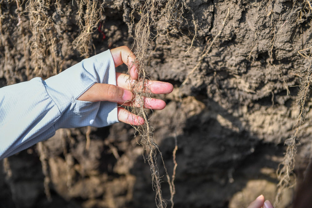 2023年7月31日,在位于吉林省四平市梨樹(shù)縣的中國(guó)農(nóng)業(yè)大學(xué)“科技小院”保護(hù)性耕作試驗(yàn)田,一名學(xué)生查看玉米根部在黑土中的生長(zhǎng)情況。