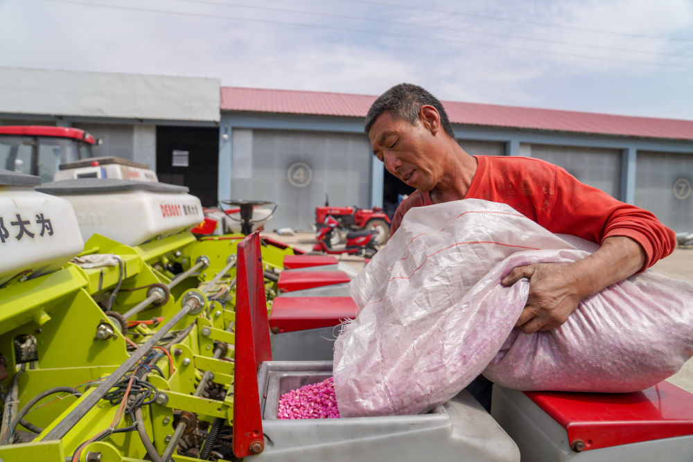 2020年5月7日,在吉林省四平市梨樹(shù)縣康達(dá)農(nóng)機(jī)農(nóng)民專業(yè)合作社,農(nóng)民向免耕播種機(jī)里投放玉米種子。