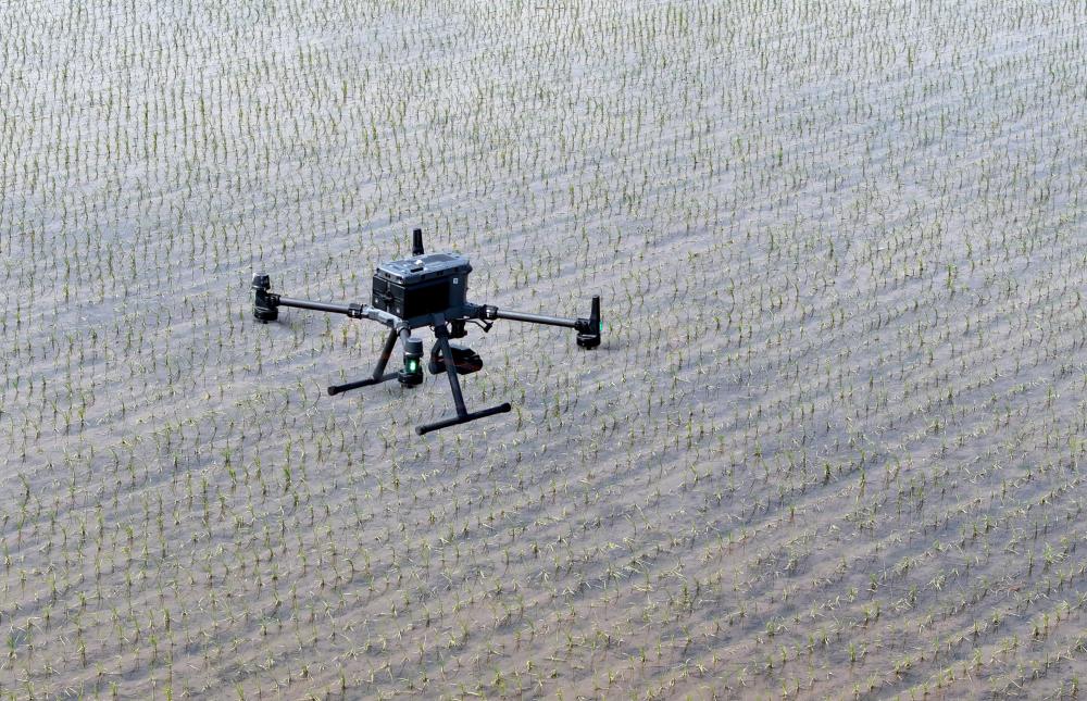2025年5月21日,在黑龍江省北大荒農(nóng)業(yè)股份八五六分公司第六管理區(qū)農(nóng)業(yè)現(xiàn)代化示范區(qū),搭載多光譜、可見(jiàn)光攝像頭的無(wú)人機(jī)對(duì)水稻插秧后田塊進(jìn)行土壤墑情監(jiān)測(cè)(無(wú)人機(jī)照片)。